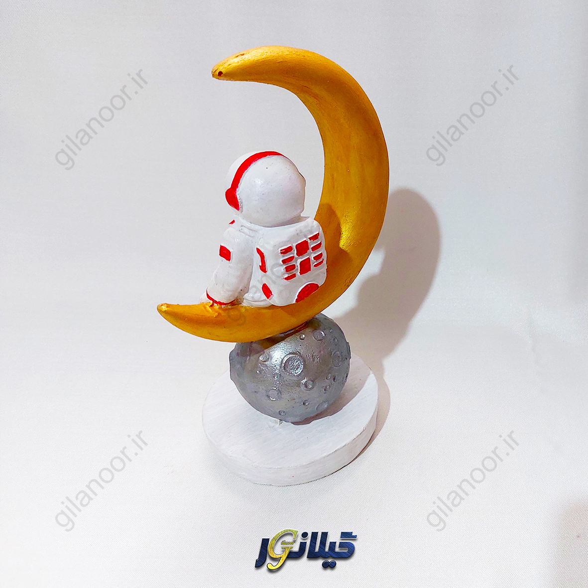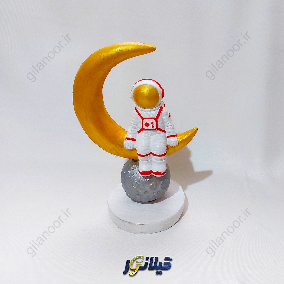فضانوردی با لباس سفید و جزئیات طلایی، ایستاده بر سطحی شبیه ماه، در آغوش هلالی طلایی از ماه قرار گرفته است؛ نمادی از رؤیاهایی که فراتر از زمین میروند. پایه سفید و طراحی متعادل آن، این مجسمه را به انتخابی عالی برای میز کار، کتابخانه، یا دکور اتاق کودک تبدیل کرده است.